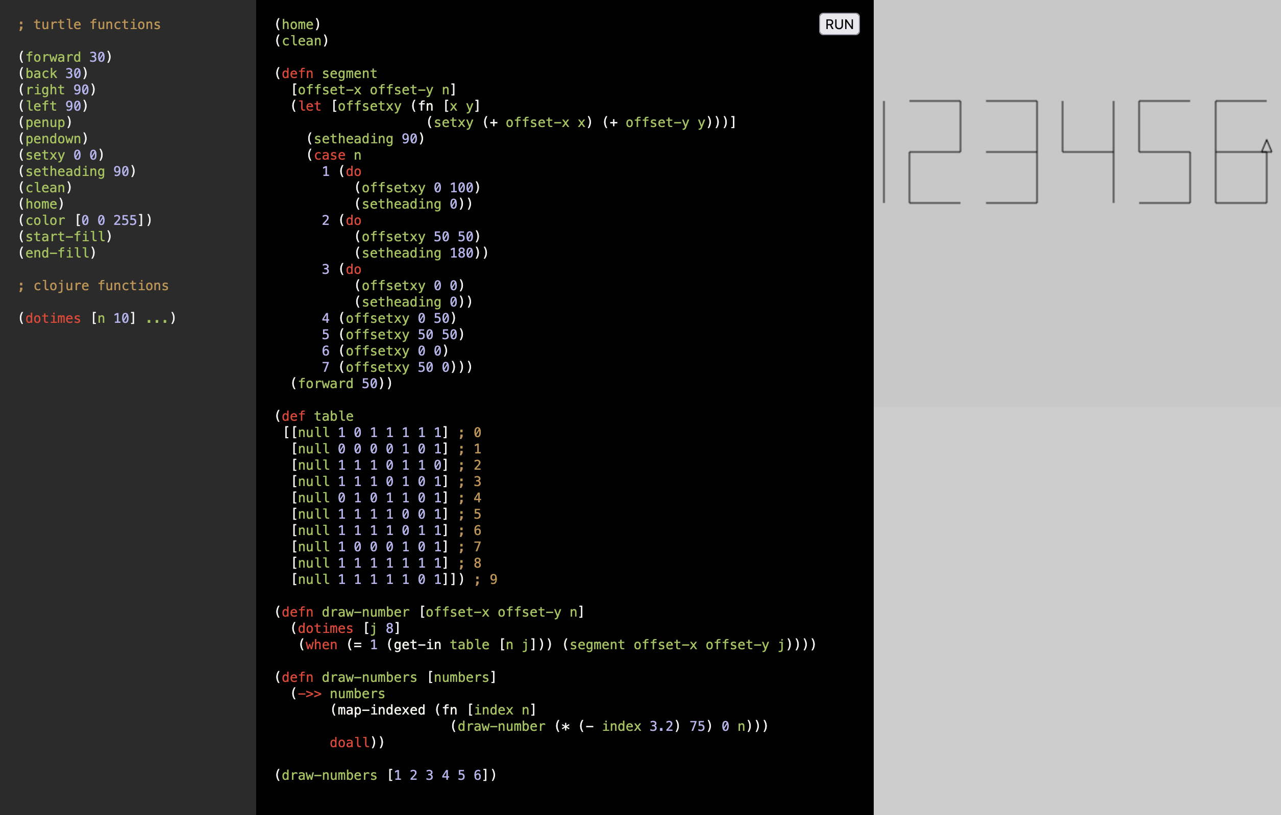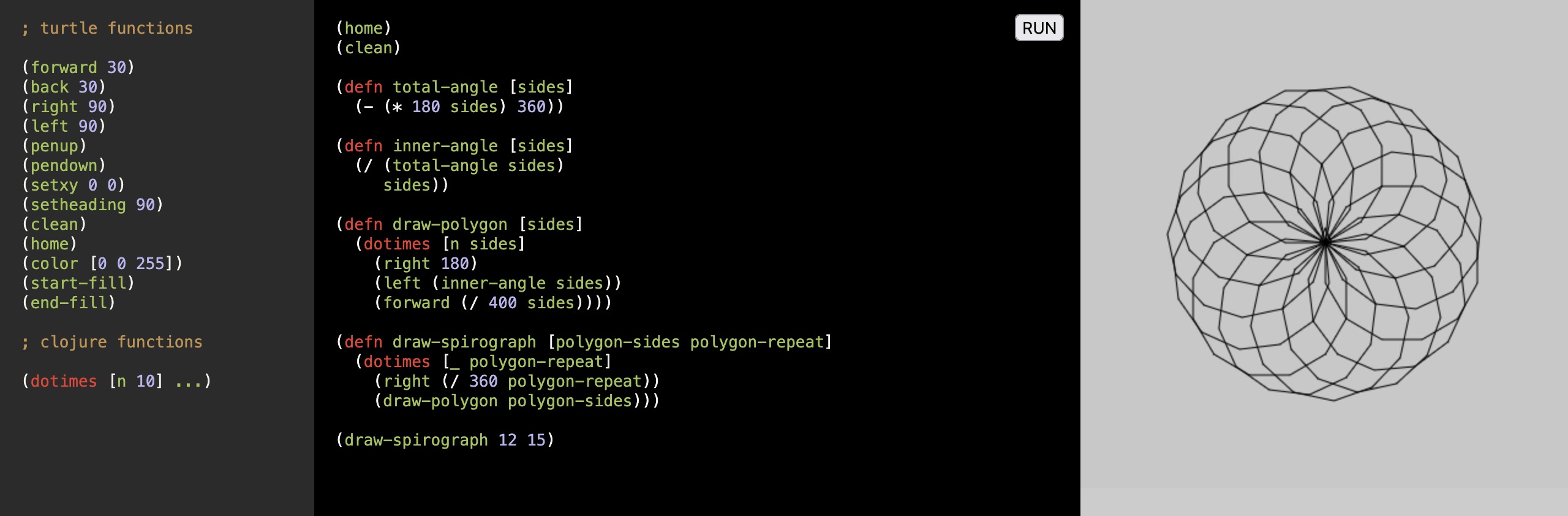 Clojure Turtle is a web-based environment akin to Logo): you write code to control a turtle that draws lines on a screen.