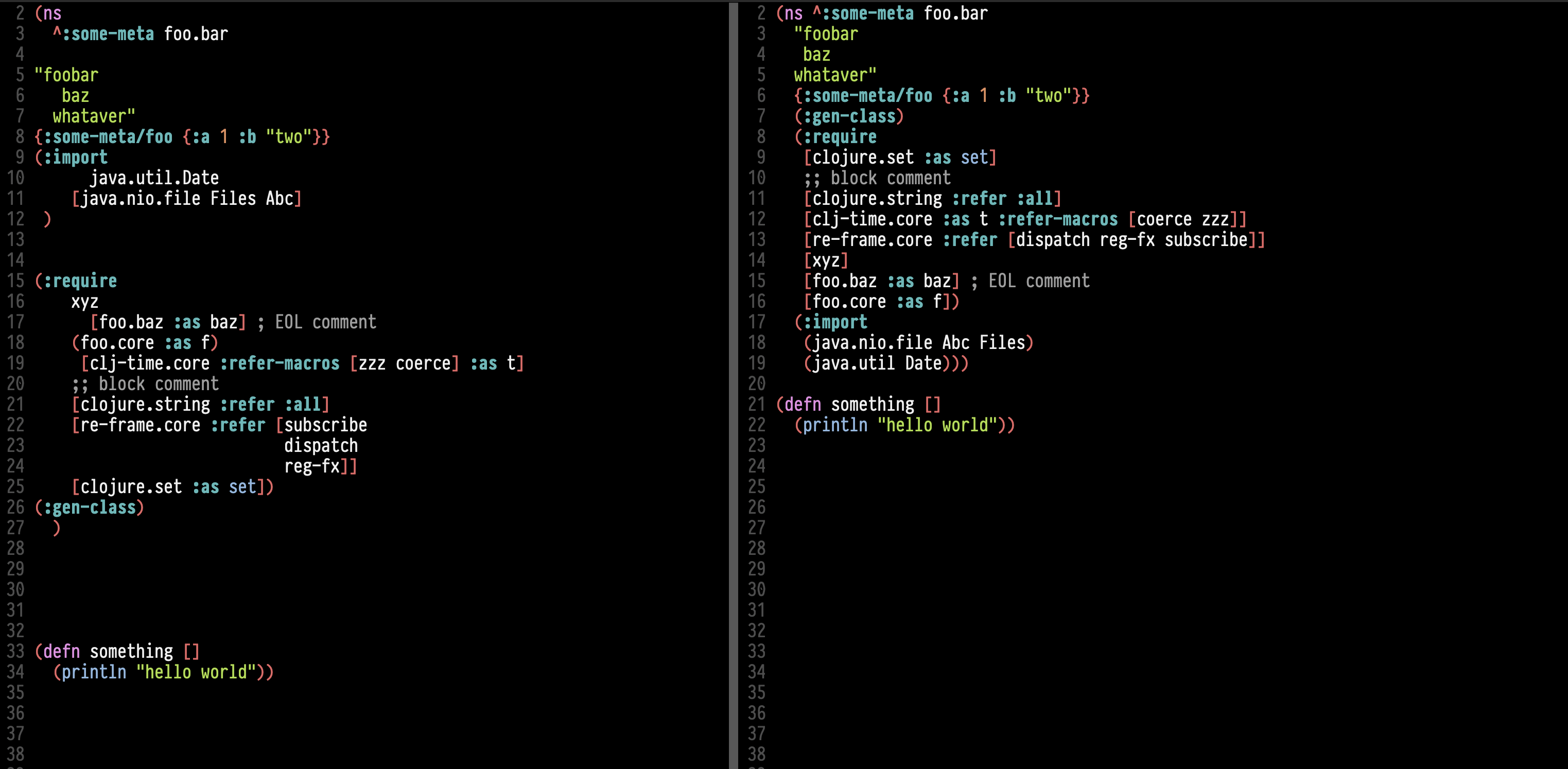 James and I thought it would be trivial, but, the ns form is fairly complex, especially when you allow for comments, and so it ended up being 350-ish lines of finicky manipulation (greatly aided by rewriteclj).