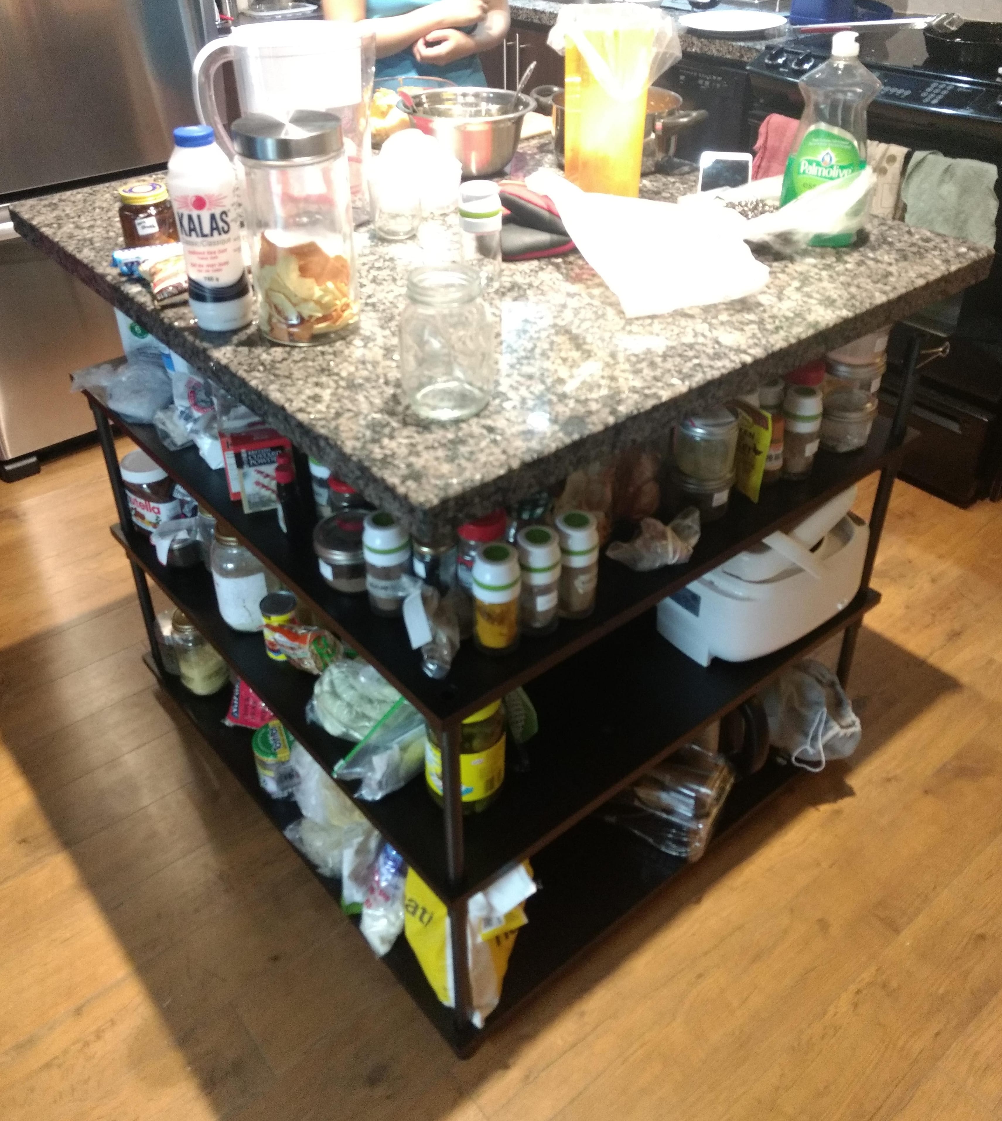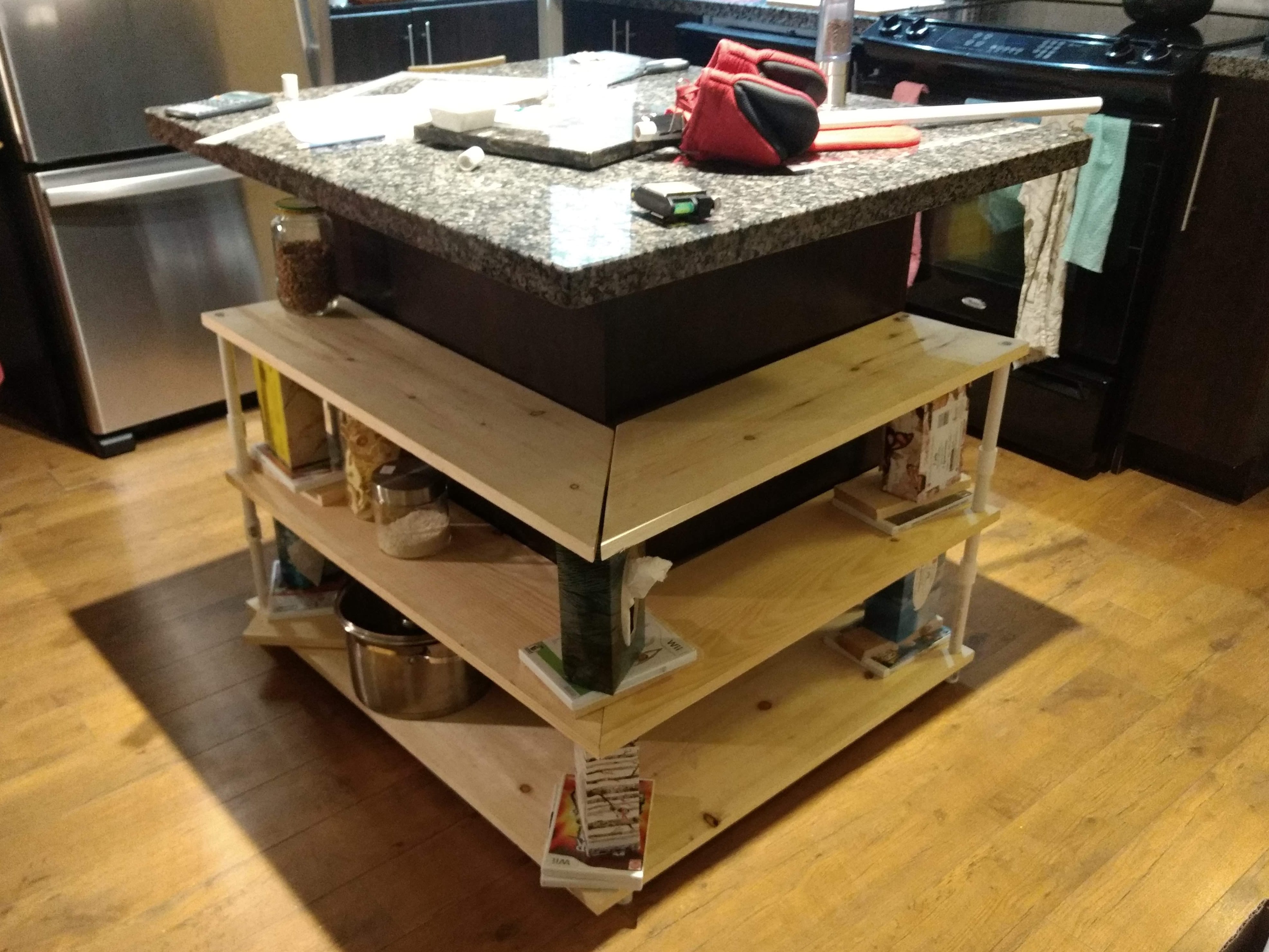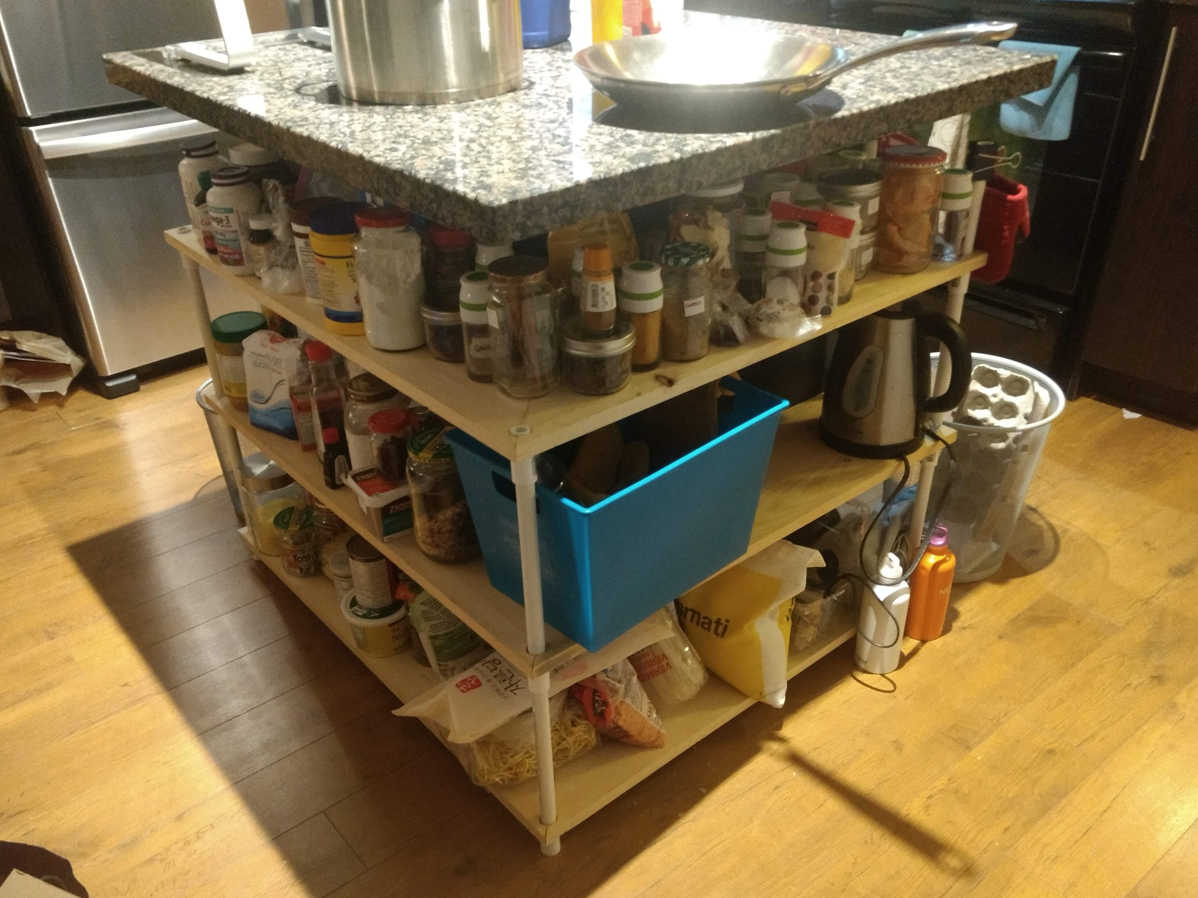 Our kitchen lacks pantry space, and our kitchen island had space for bar stools we were never gonna buy, so I made some custom shelves instead: