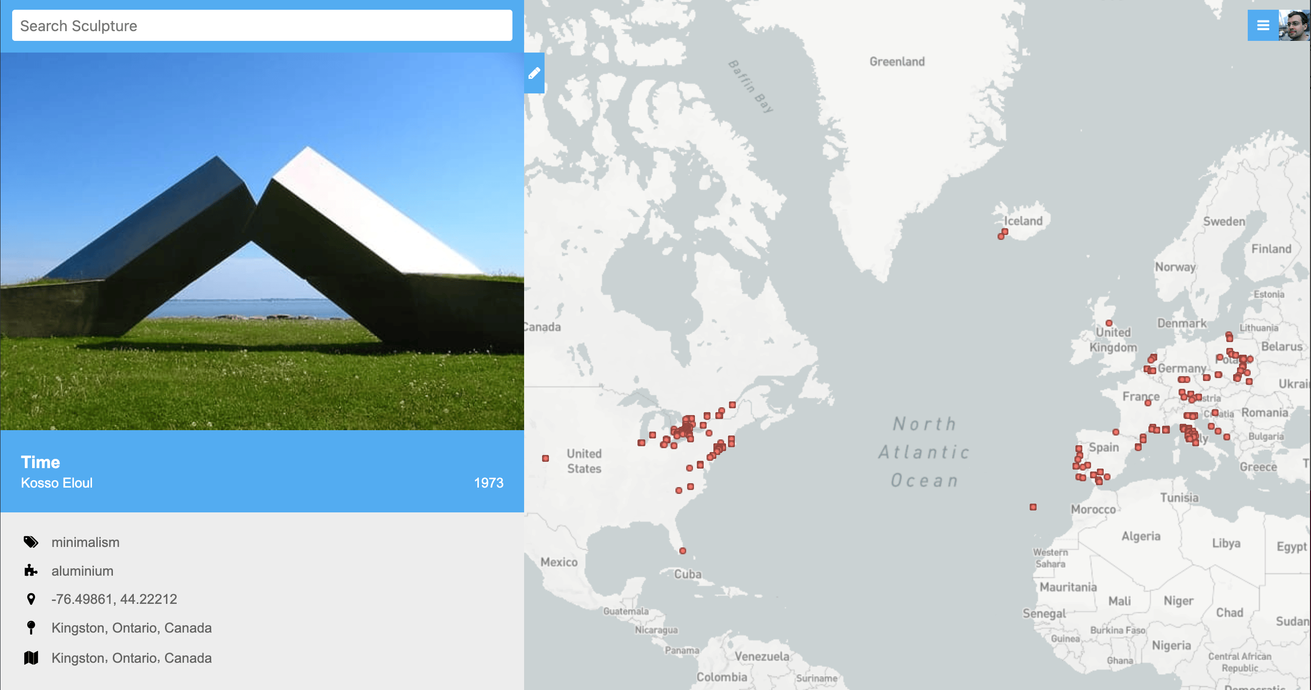 In early 2017, empowered by several years of professional projects in Clojure, (and a growing backlog of sculpture photos) I returned to the sculpture project and started to rewrite the site in Clojure. The UI was heavily inspired by Google Maps (which I now itch to change). The new admin interface made it much easier to upload and edit sculptures, enabling my dad to keep adding ...and adding ...and adding.