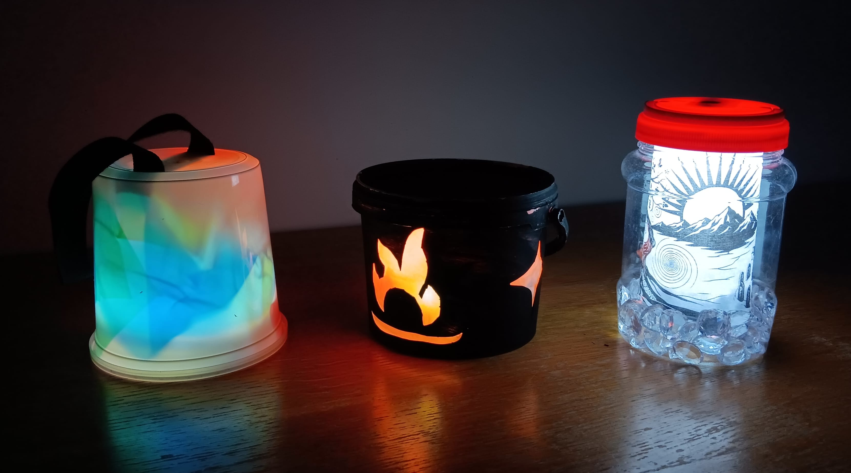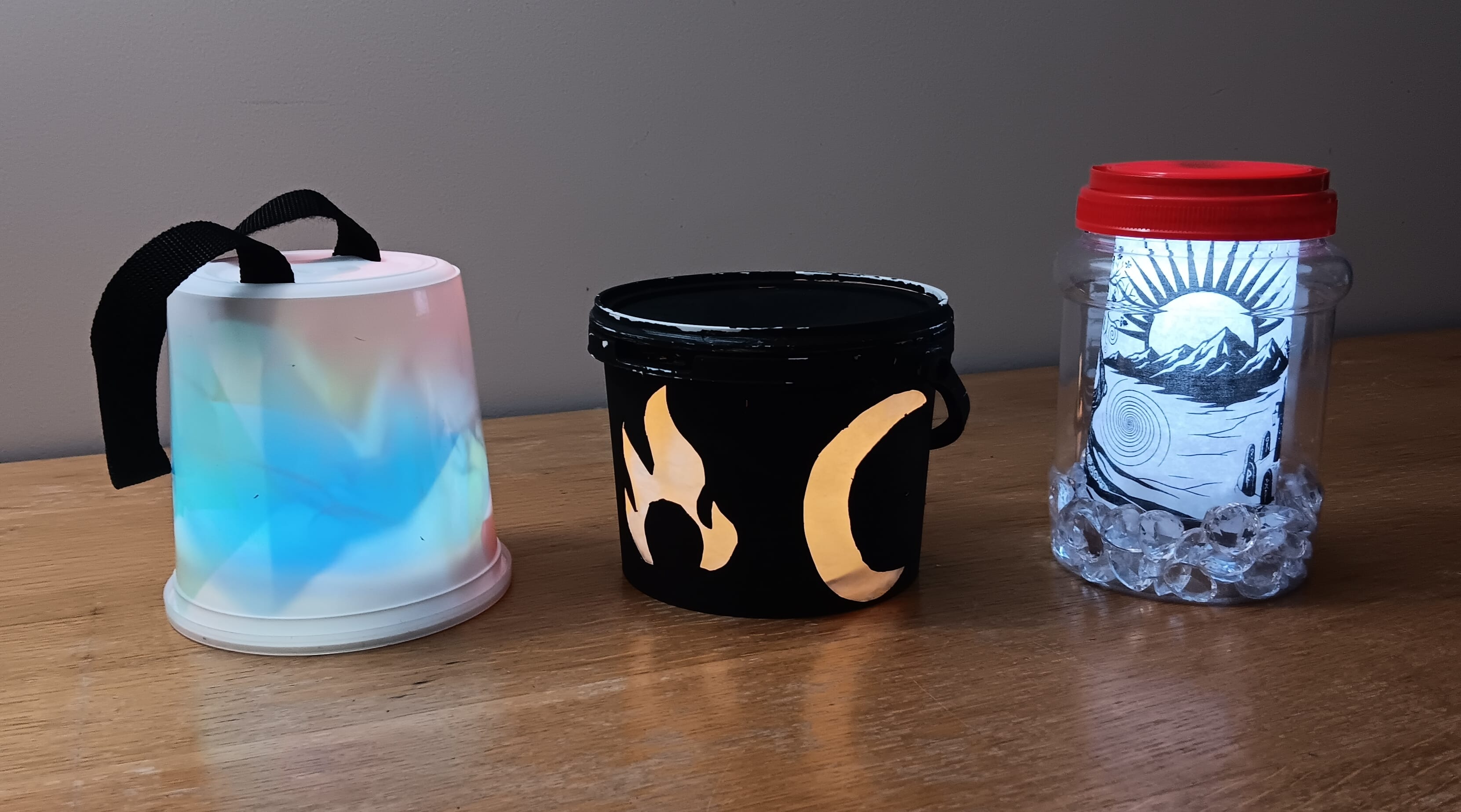 The third - "mine" - is yet another food container, with some plastic clear gemstones, some AI generated solstice-themed imagery printed on paper, lit up by an LED bike light.