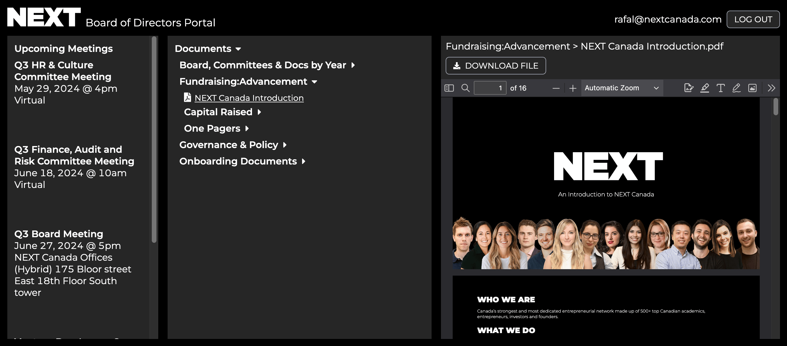 The Board Portal is a website I created for Next Canada to securely share documents with their board members.