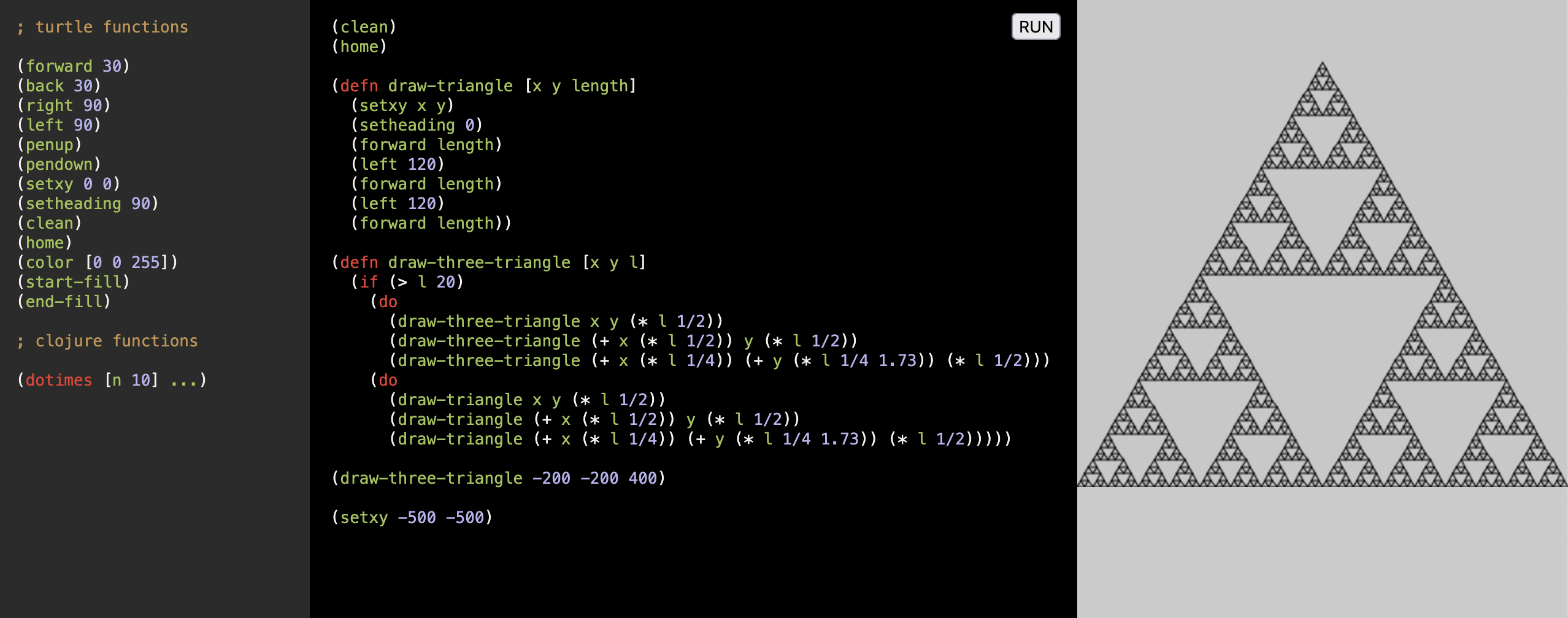 Clojure Turtle is a web-based environment akin to Logo): you write code to control a turtle that draws lines on a screen.
